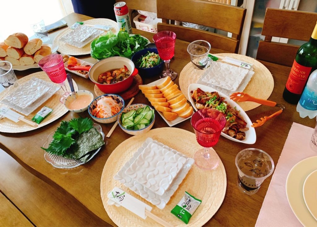 バインミーの材料、挟む具材や持ち寄りのお料理が並んだテーブル。