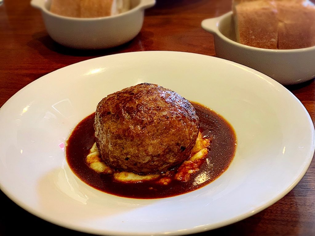 当初、飴色にソテーされた玉ねぎが敷かれ、その上にハンバーグが鎮座していたようですが。現在、玉ねぎはなくなりマッシュポテトになりました。