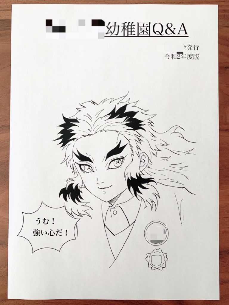 表紙も、遊び心を取り入れて。幼稚園が掲げる「五つの心」を元に、幼稚園の制服姿の鬼滅キャラを5パターン描いたり。