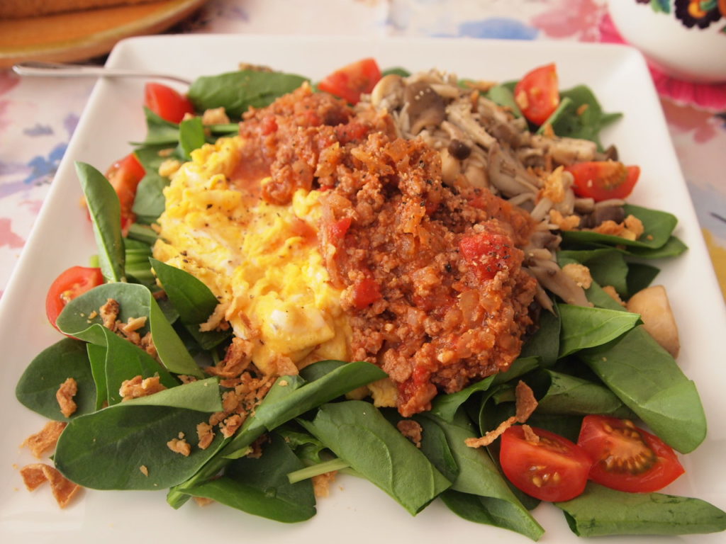 サラダほうれん草をたっぷり敷いて、ふわとろスクランブルエッグをオン。