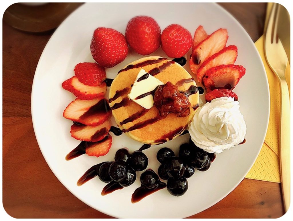 ホットケーキに芳醇なバターが香り、いちごジャムにチョコソースの分量がベストバランス、ふわふわホイップクリーム、フレッシュいちごやブルーベリーのさわやかさ、
