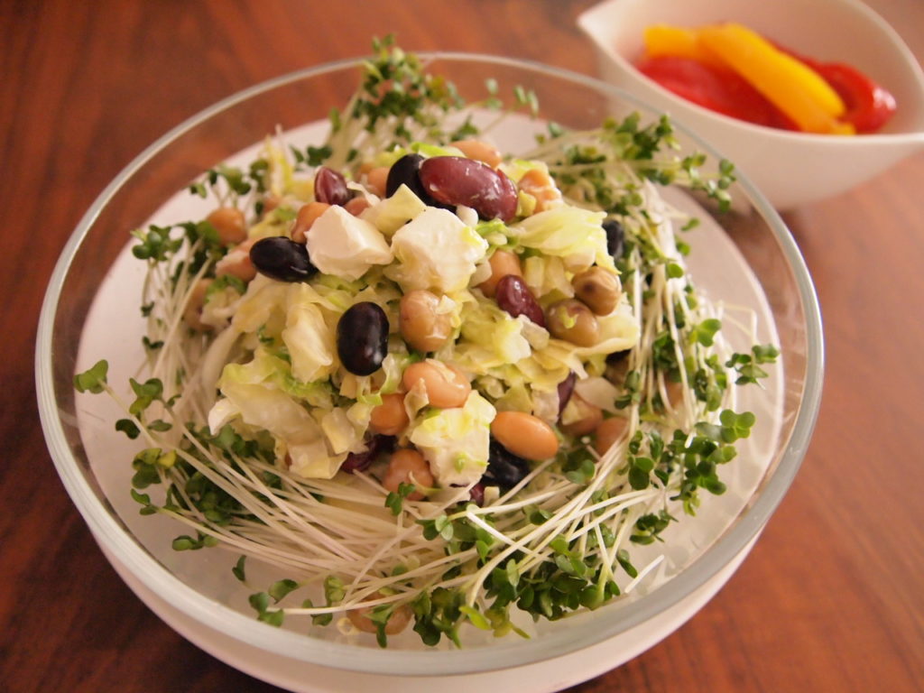 千切りキャベツの塩もみに、蒸し豆とクリームチーズを混ぜ合わせて。味付けは、塩、マヨネーズとレモン汁をたっぷり。さわやかさとコクが同居した簡単絶品サラダです。