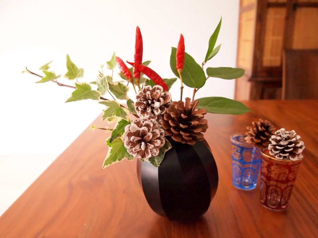もものお誕生日に彩りを添えてくれたミニブーケ。お花は枯れてしまったけれど、松ぼっくりや唐辛子は生きている。
